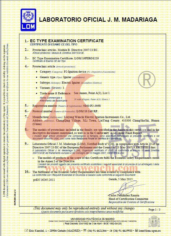 瀏陽(yáng)市文馳電點(diǎn)火具有限公司(原培文電子點(diǎn)火器材廠),創(chuàng)建于1998年,是一家專業(yè)從事研制銷售電子點(diǎn)火產(chǎn)品的民營(yíng)科技企業(yè),是我國(guó)第1枚煙花用電點(diǎn)火頭生產(chǎn)者,是《煙花爆竹電點(diǎn)火頭國(guó)標(biāo)》牽頭起草單位。公司位于中國(guó)“煙花之鄉(xiāng)”湖南省瀏陽(yáng)市,地理位置優(yōu)越,交通便利。 我公司研制的對(duì)象是用電能引燃火藥、做機(jī)械功等預(yù)定功能的一次性使用的元件或裝置,包括電點(diǎn)火頭(英文名ElectricMatch or Electric Igniter,中文俗稱“電火柴”或“電發(fā)火頭”)、電點(diǎn)火管和延期電點(diǎn)火管;我們估且在以后的產(chǎn)品技術(shù)欄中將我們研究的產(chǎn)品統(tǒng)稱為電點(diǎn)火具,將電點(diǎn)火器看成是用于提供和控制供給電點(diǎn)火元件點(diǎn)火的電能器材;我們研究的電點(diǎn)火橋路有橋絲式、無(wú)橋絲···